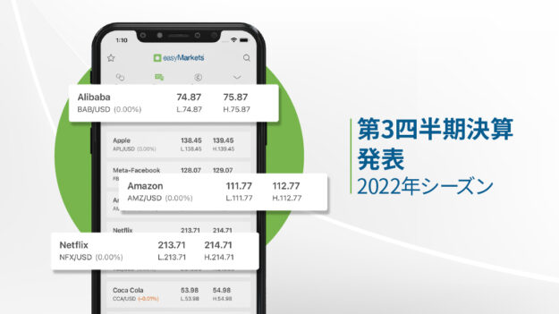 2022年は、株式市場にとって良い年ではありませんでした。実際、2008年以来、最悪の成績となったのです 米国の3大指数は大きな損失を被り、ナスダックは33.1%、S&P500は19.4%、ダウ30は8.8%の下落を記録した。 高騰するインフレ、金利上昇、景気後退懸念など、多くの要因が投資家を怯えさせ、ポジションを売り抜ける原因となった。しかし、企業のQ4’22の決算発表が、2022年に被った損失の一部を取り返すのに役立つのだろうか。予想を上回る好調なシーズンは、株式市場にとって強気となる可能性が高い。一方、予想を下回る決算となれば、下押し圧力が強まるだろう。 今回の決算がどうであれ、株式市場は乱高下することは間違いない。そして、変動があるときこそ、取引のチャンスとなる可能性があるのです。   easyMarketsで2022年度第四四半期決算をトレードする easyMarketsなら相場の上昇時のみならず下落時にもCFD取引で「買い」「売り」両方で取引が出来ます。‐その為どんな局面でも利益獲得のチャンスがあります。 easyMarketsで取引すると以下のような利点があります。 マイナス残高保護機能、保証されたストップロスとテイクプロフィットがウェブ、アプリもしくはTradingViewで。 Web、アプリ、TradingViewでスリッページなし 狭い固定または変動スプレッド – あなたの戦略に最適なものをお選びください。 取引手数料、その他隠れた手数料は一切なし。 どの企業の決算がいつ行われるかは、以下の決算カレンダーをご覧ください。 決算カレンダーを見る *指値注文に限る